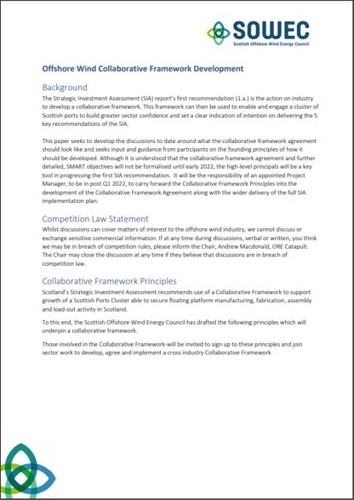 Scotland’s Strategic Investment Assessment recommends use of a Collaborative Framework to support growth of a Scottish Ports Cluster able to secure floating platform manufacturing, fabrication, assembly and load-out activity in Scotland. To this end, the Scottish Offshore Wind Energy Council has drafted the following principles which will underpin a collaborative framework.